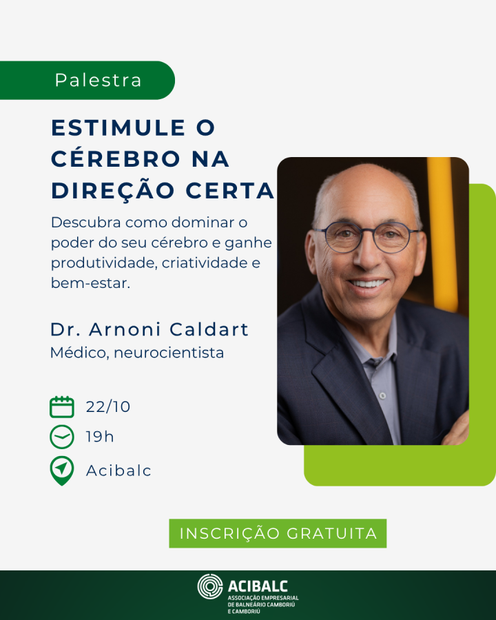 A Associação Empresarial de Balneário Camboriú e Camboriú - ACIBALC promove nesta quarta-feira, 22 de outubro, às 19h, a palestra gratuita “Estimule o cérebro na direção certa”, com o Dr. Arnoni Caldart, médico, neurocientista, autor best-seller e palestrante internacional.