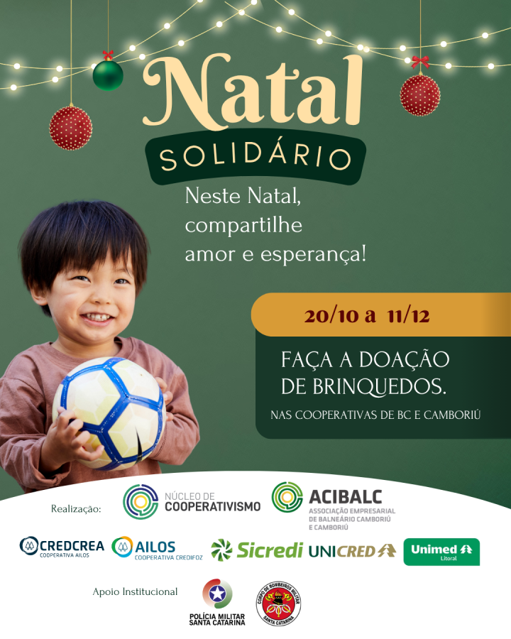 O espírito de solidariedade e união entre cooperativas marca mais uma ação do Núcleo de Cooperativismo da Associação Empresarial de Balneário Camboriú e Camboriú - ACIBALC. Desde o dia 20 de outubro, o núcleo realiza uma campanha de arrecadação de brinquedos com o objetivo de proporcionar um Natal mais alegre para crianças em situação de vulnerabilidade nos dois municípios.
