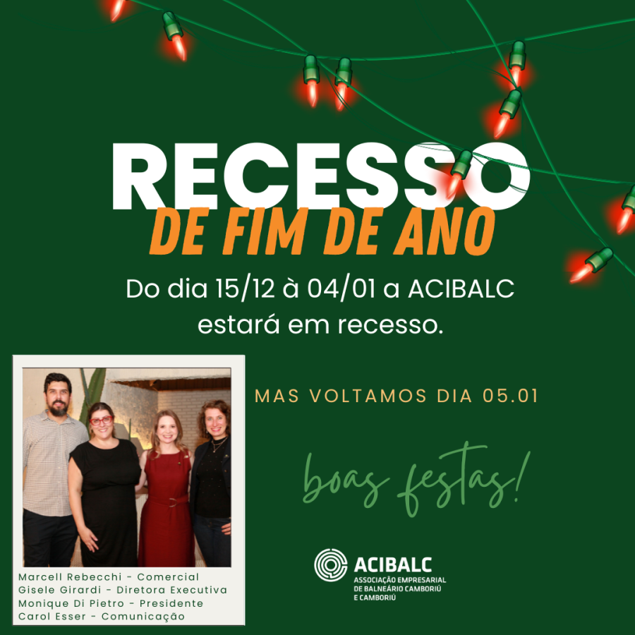 A Associação Empresarial de Balneário Camboriú e Camboriú - ACIBALC, comunica que entrará em recesso do dia 15 de dezembro à 4 de janeiro. As atividades serão retomadas no dia 5 de janeiro com atendimento em horário normal, das 9h às 12h e das 13h às 18h.