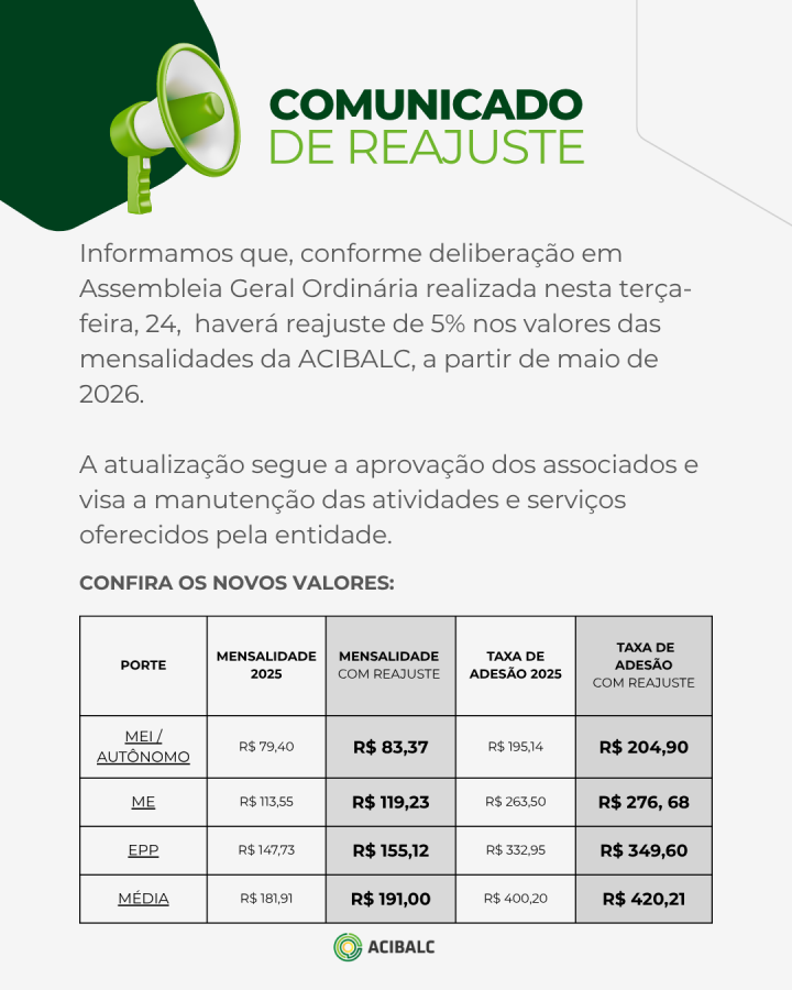 Ficou definido, o reajuste de 5% nos valores das mensalidades, que passará a vigorar a partir do mês de maio de 2026.